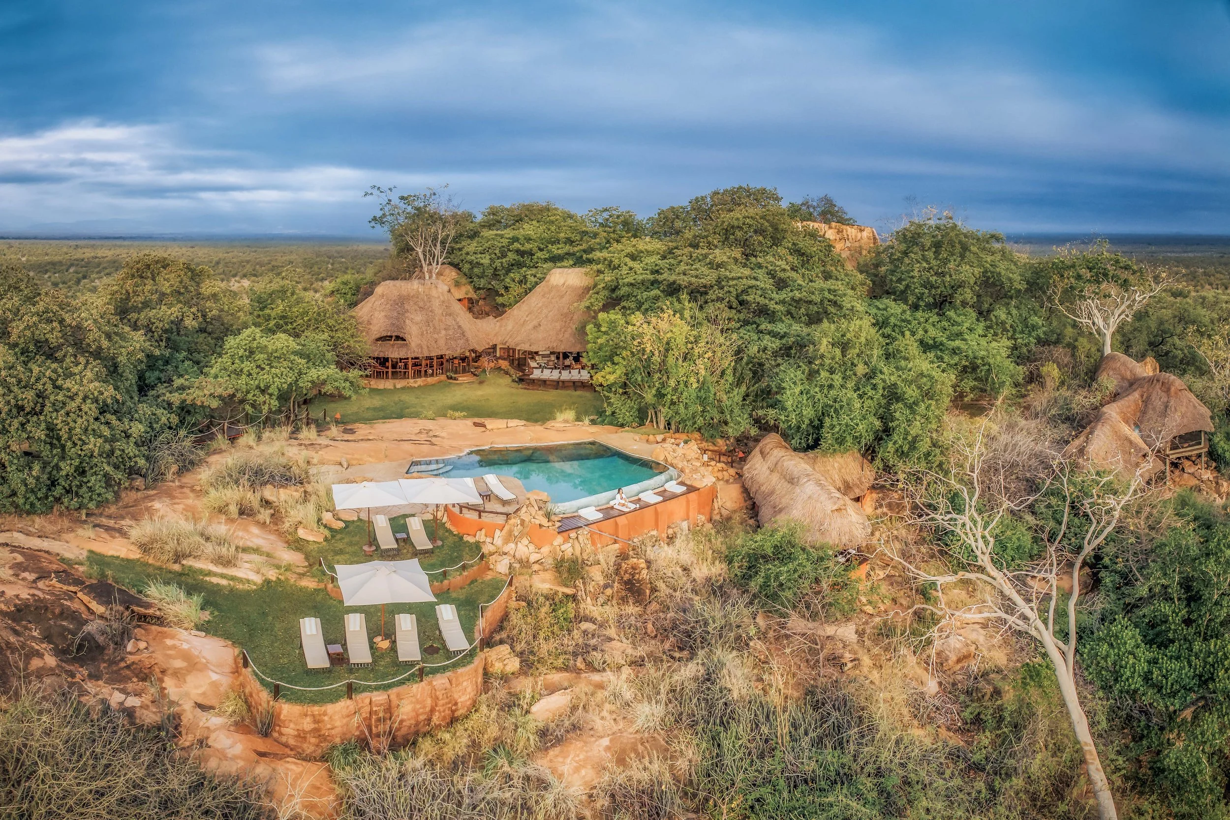 Stay at Elsa's Kopje, a unique lodge built into the Mughwango Hill, offering panoramic views of Meru's landscapes.